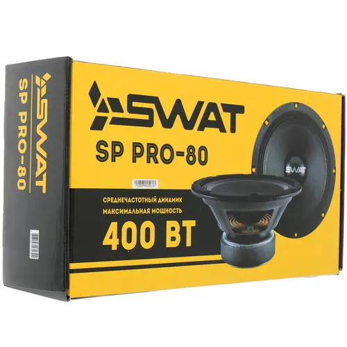 Широкополосная акустическая система SWAT SP PRO-80 характеризуется чувствительностью, равной 93 дБ, и импедансом, составляющим 4 Ом. Номинальная мощность акустики равна впечатляющим 200 Вт. Максимальная мощность вдвое выше: 400 Вт.