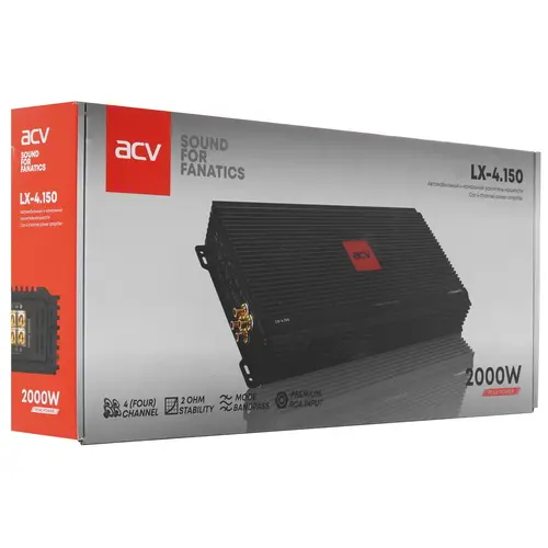 Усилитель ACV LX-4.150 помогает добиться более насыщенного, экспрессивного и реалистичного звучания в составе автомобильной акустической системы. Усилитель класса AB отличается поддержкой 4-х каналов звука с выходной мощностью по 150 Вт каждый. Питание усилителя осуществляется от аккумулятора с напряжением 12 В. К особенностям модели относится функция регулировки уровня баса. Технологии защиты от перегрузки и короткого замыкания повышают безопасность в эксплуатации, а также помогают снизить риск появления различных искажений звука в процессе воспроизведения.