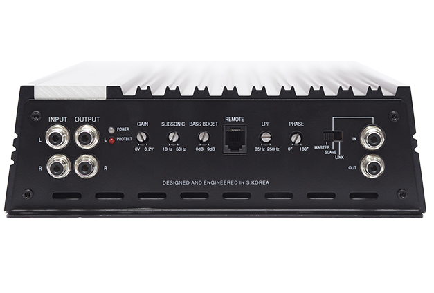 Лучший вариант схематехники, разработанный на базе производства в Южной Корее Стабильно работает на нагрузку 1 Ом. Мощность 1800 Вт на нагрузку 1 Ом, при напряжении 14.8 вольта и К.Н.И. на уровне ~5%, что является нормой для сабвуферного звена. Дистанционный регулятор уровня входной чувствительности имеет светодиодный индикатор превышения порога допустимых искажений. Возможна работа в режиме «мостового включения» 1-канальный усилитель (моноблок) звука для аудио системы автомобиля Класс D
