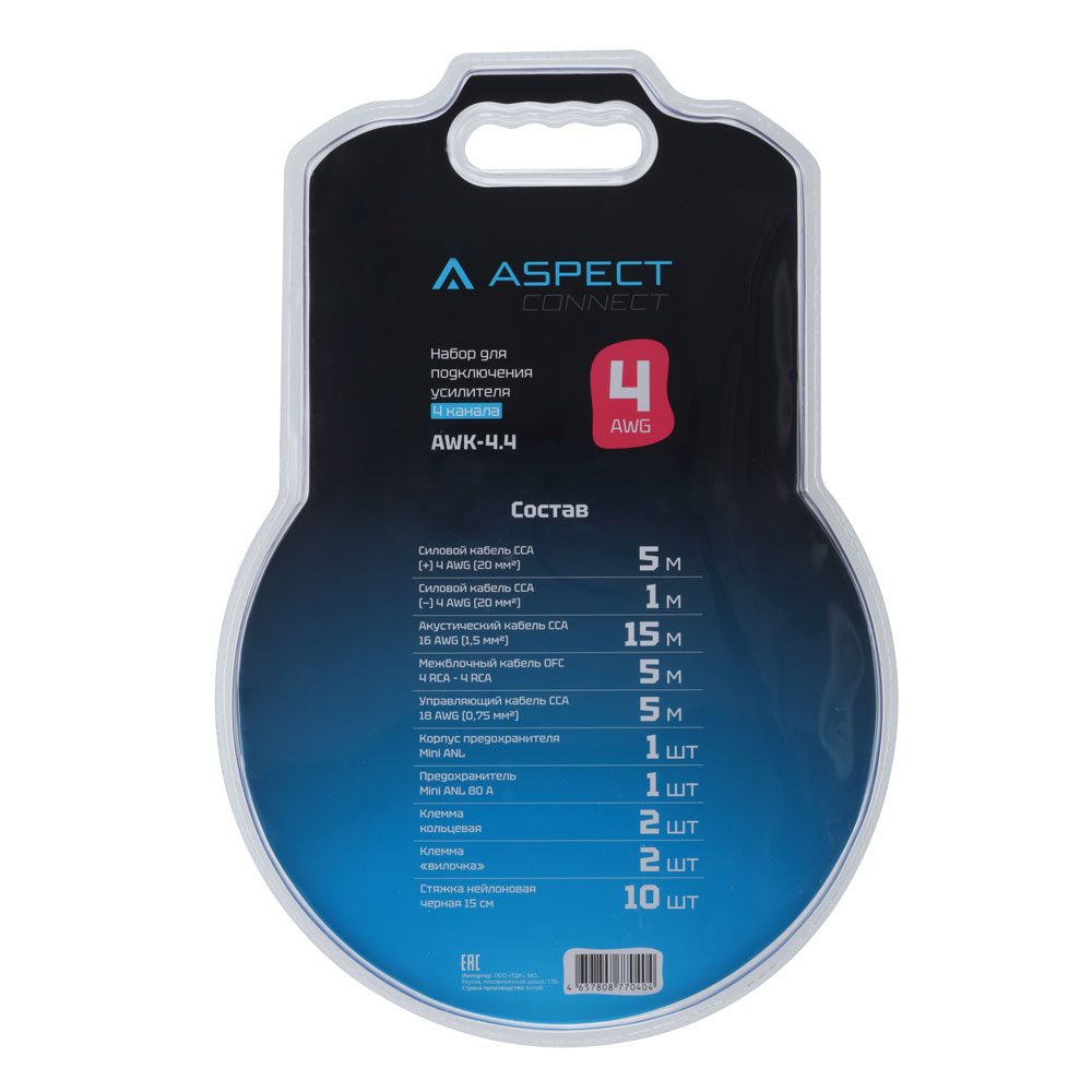 Установочный комплект Aspect AWK-4.4 предназначен для подключения 4-канального усилителя с рекомендуемой мощностью до 1200 Вт. В его состав входят кабели различной функциональности, а также монтажные аксессуары для надёжного и безопасного подключения.